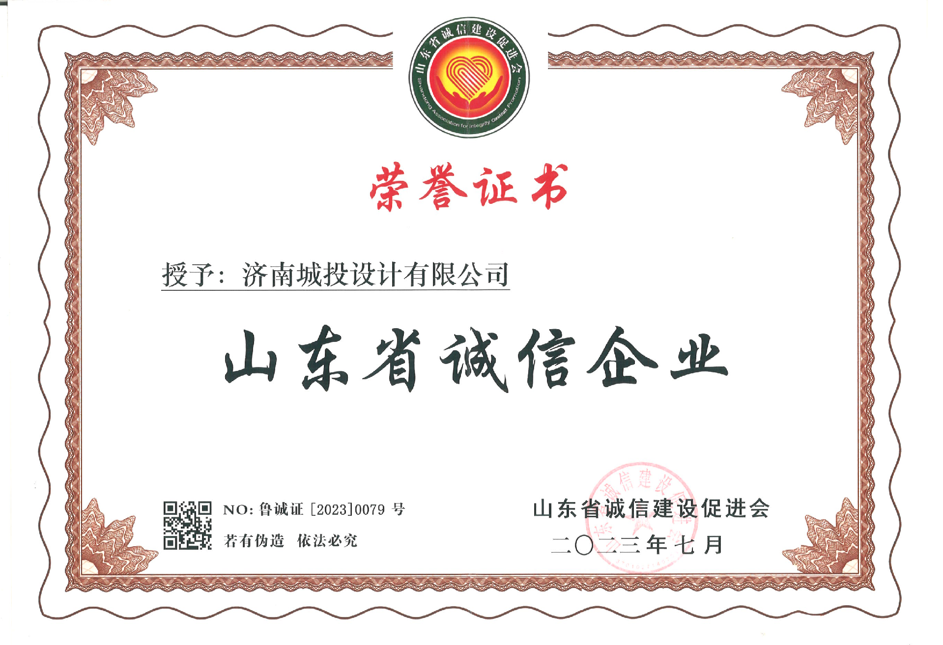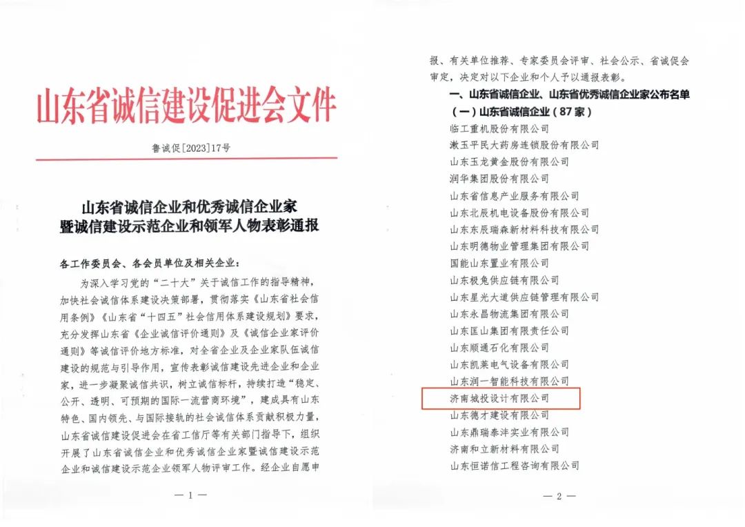 多年來,濟(jì)南城投設(shè)計(jì)有限公司以“為生態(tài)更文明,讓生活更美好”為企業(yè)使命,積極踐行“知行合一,為人民服務(wù)”的企業(yè)核心價(jià)值觀……將誠信品質(zhì)深深融入到公司的企業(yè)文化和生產(chǎn)經(jīng)營中,塑造了良好的企業(yè)形象,樹立了良好的社會聲譽(yù)。